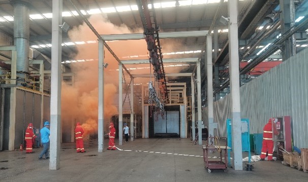 湖南中钢智能装备有限公司按照预定方案进行“消防应急演练”,活动包括:“消防器材使用介绍”“实际操作灭火器”、“涂装车间模拟火情”。