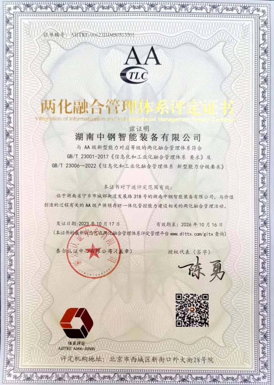 近日,湖南中钢集团旗下湖南中钢智能装备有限公司顺利通过国家工业和信息化部 GB/T 23001-2017 《信息化和工业化融合管理体系要求》及GB/T23006-2022《信息化和工业化融合管理体系 新型能力分级要求》体系认证,获得AA级两化融合管理体系评定证书,标志着湖南中钢智能装备有限公司在新型工业化的道路上迈上新台阶。