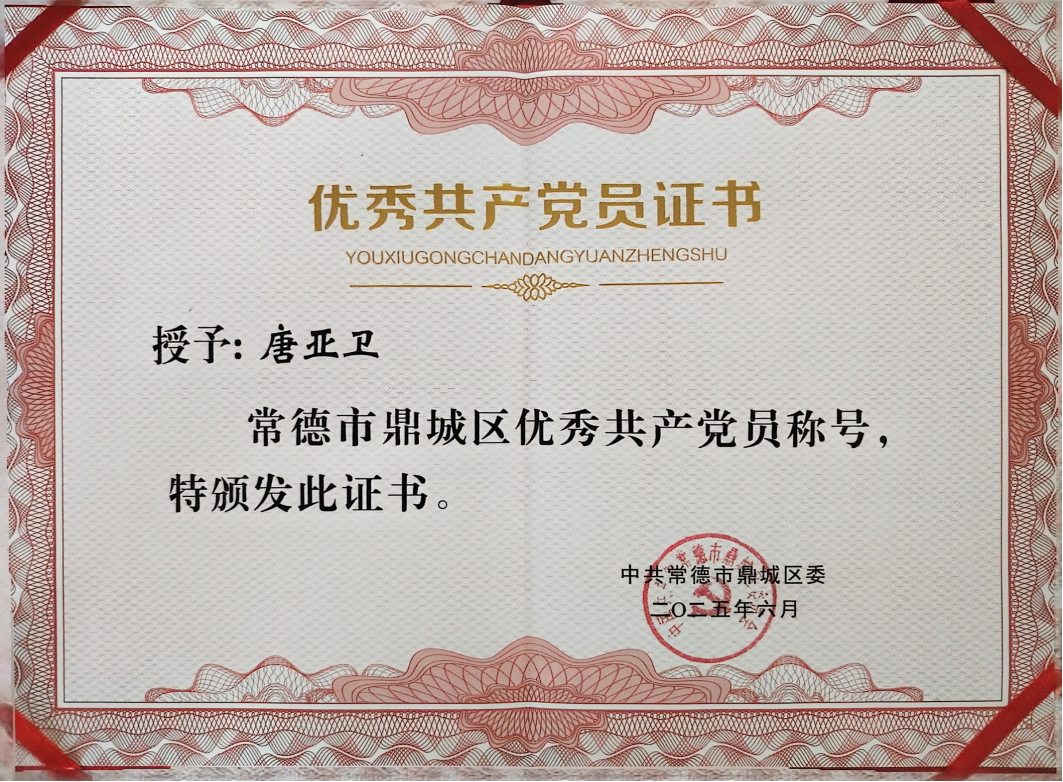 武陵机械唐亚卫荣获常德市鼎城区“优秀共产党员”称号!