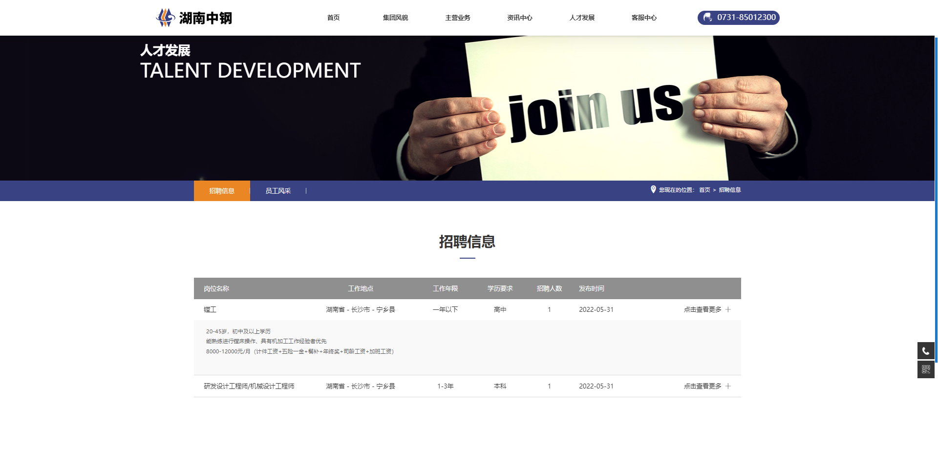 “人才发展”下设“招聘信息”、“员工风采”子栏目,方便了解人员信息与员工生活。