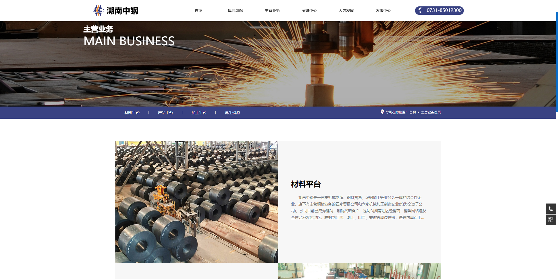 “主营业务”下设“材料平台”、“产品平台”、“加工平台”、“再生资源”四个二级栏目。